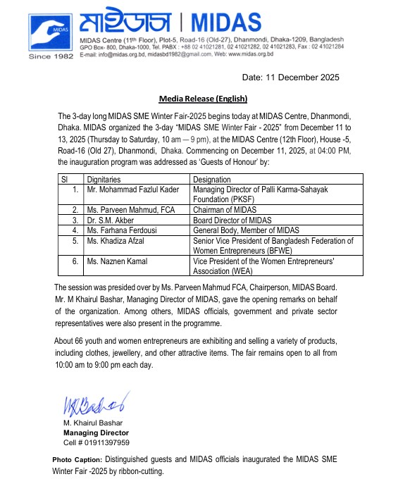 3-day long MIDAS SME Winter Fair-2025 begins at MIDAS Centre, Dhanmondi, Dhaka